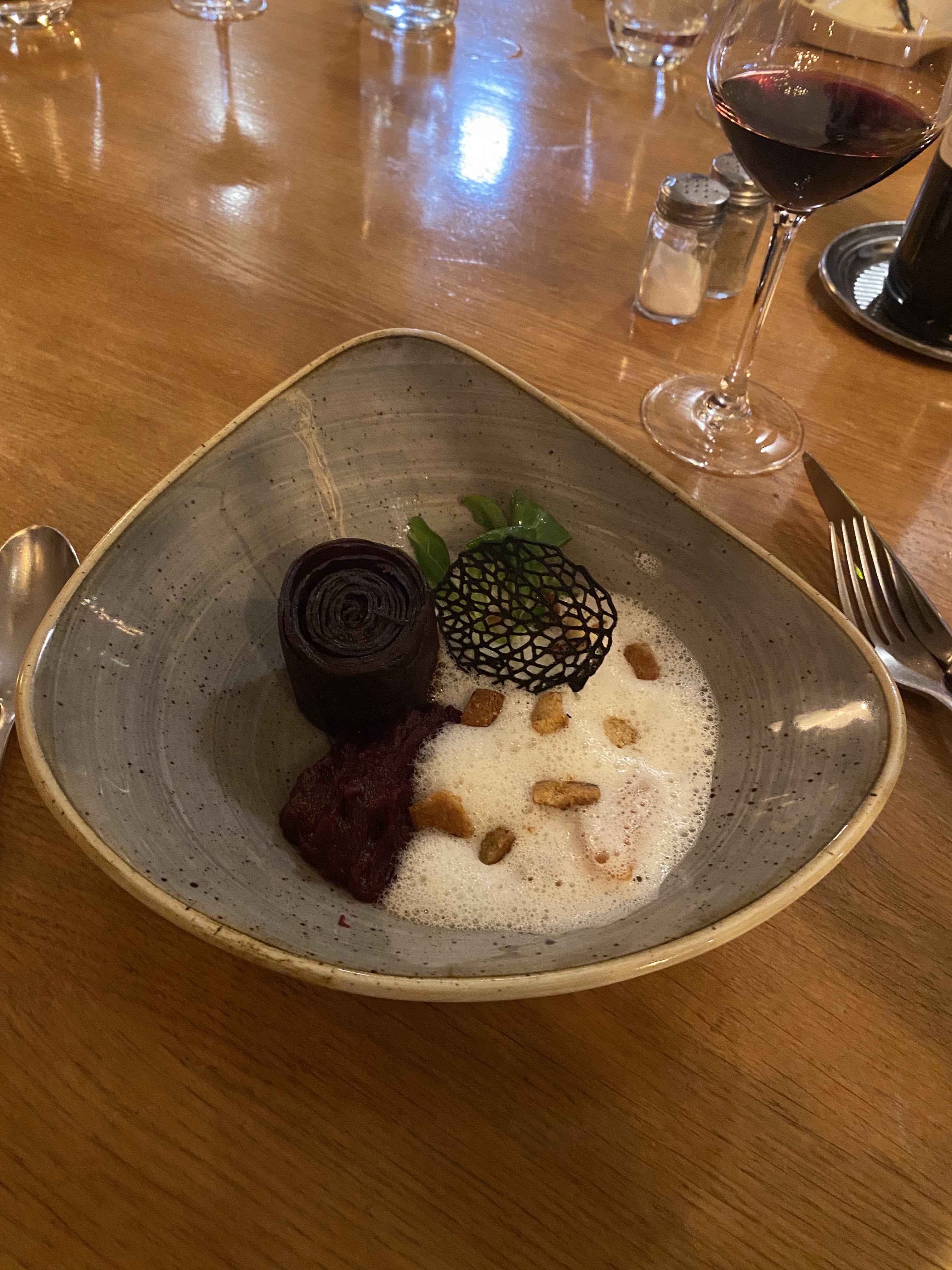 Nous avons passé un excellent moment du début à la fin. Le lieu des très chaleureux ainsi que l’accueil. Les plats étaient beaux et excellents. L’entrée était incroyable et le dessert une petite merveille. Le plat (j’ai pris le poisson dans une petite cassolette) était plein de saveurs. Sans oublier le plateau de fromage et le choix de vins. Nous allons certainement revenir ☺️. Merci encore pour ce moment