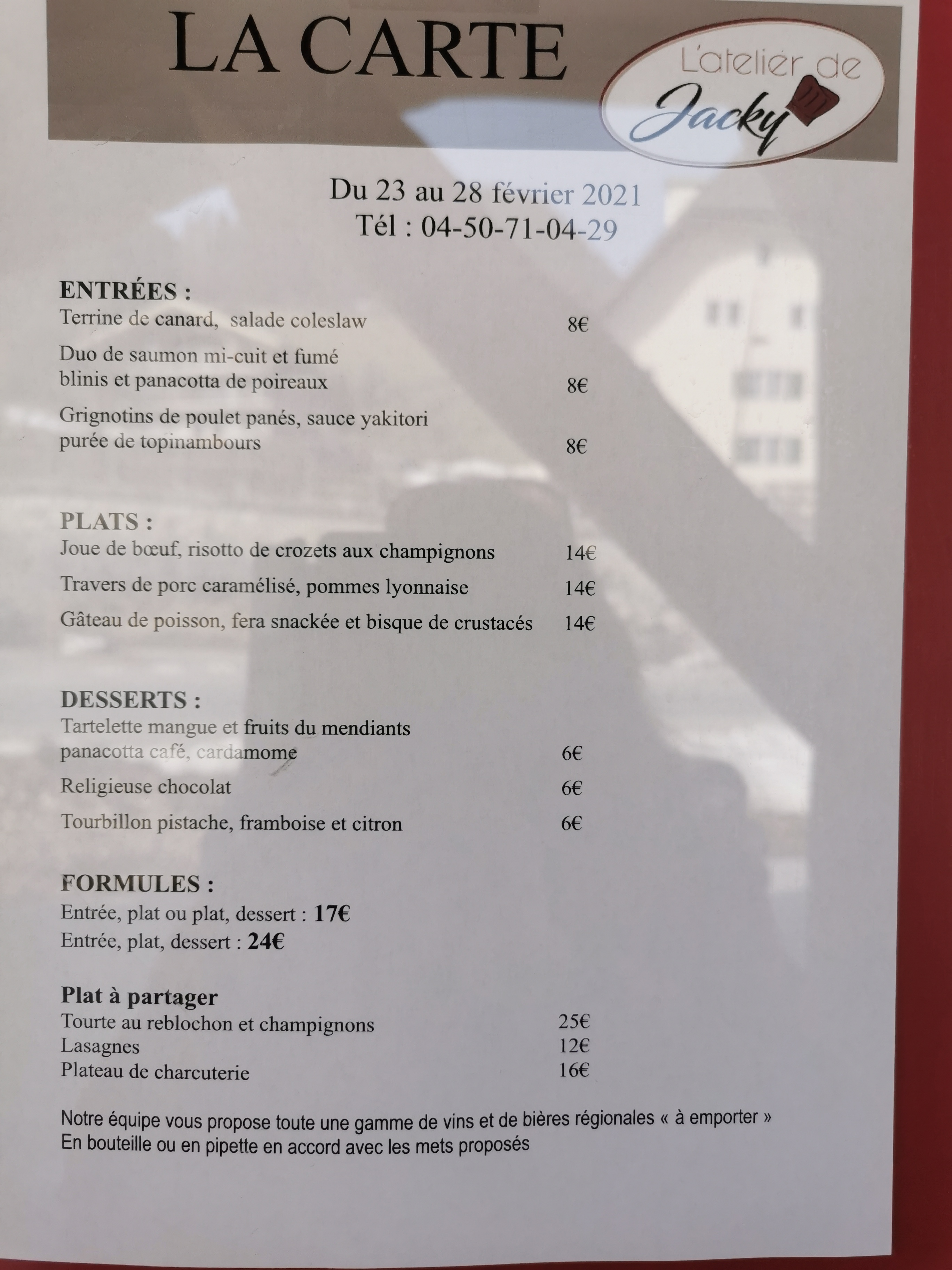 Jacky a eu l'excellente idée de faire de la vente à emporter. Le seul qui le fasse avec la qualité dans la vallée. Très courageux en ces temps... Hier entrée aux 3 champignons, délicieux. En plat, du cabillaud aux petits légumes, excellent et un dessert. Le tout très joliment présenté malgré la difficulté. Très bons conseils pour réchauffer le tout avant la dégustation. Merci Jacky et Murielle