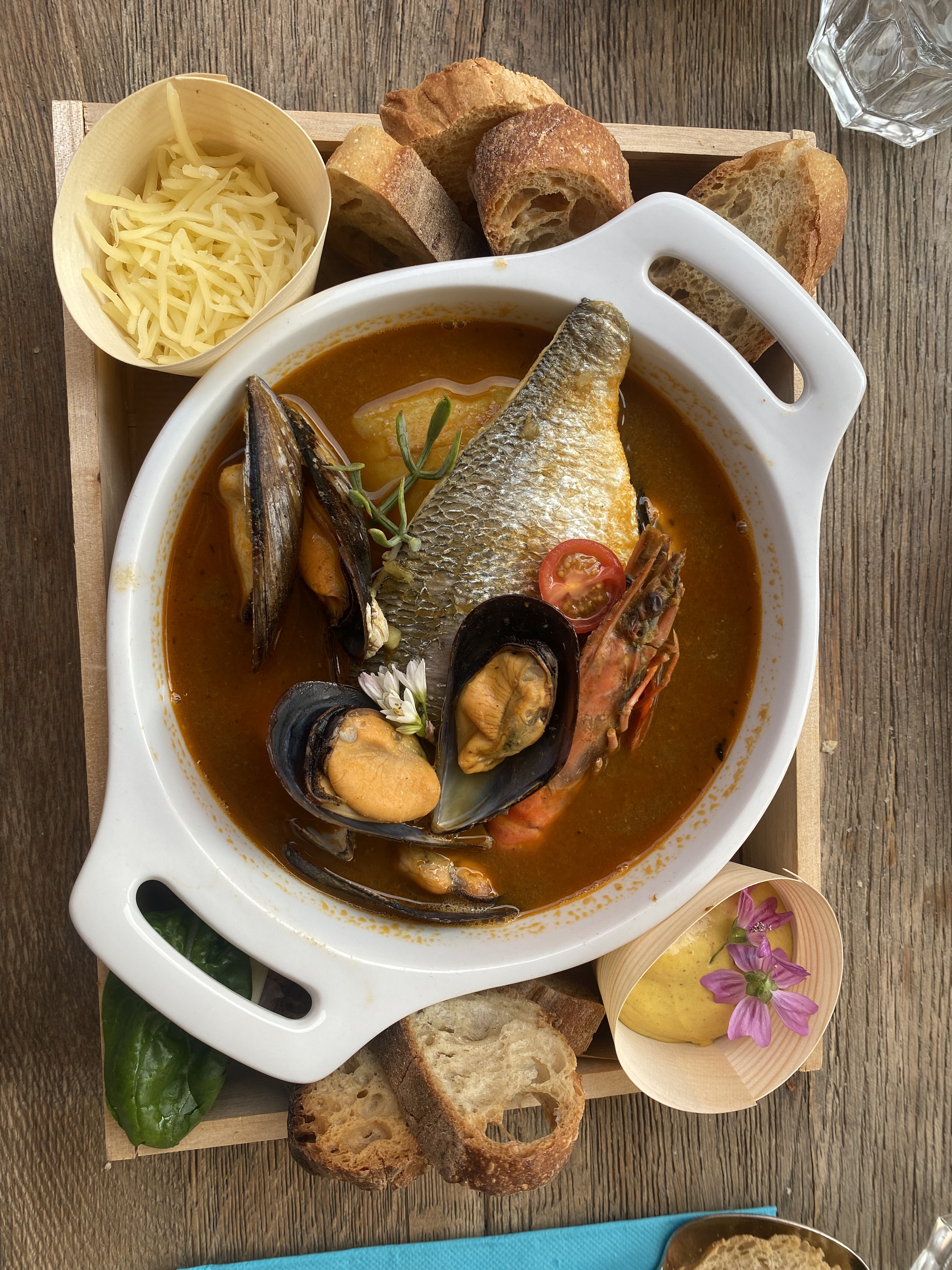 une très belle soirée, soupe de poisson excellente! personnel très agréable, et climatisation a l intérieur pour supporter les grosses chaleurs , je recommende