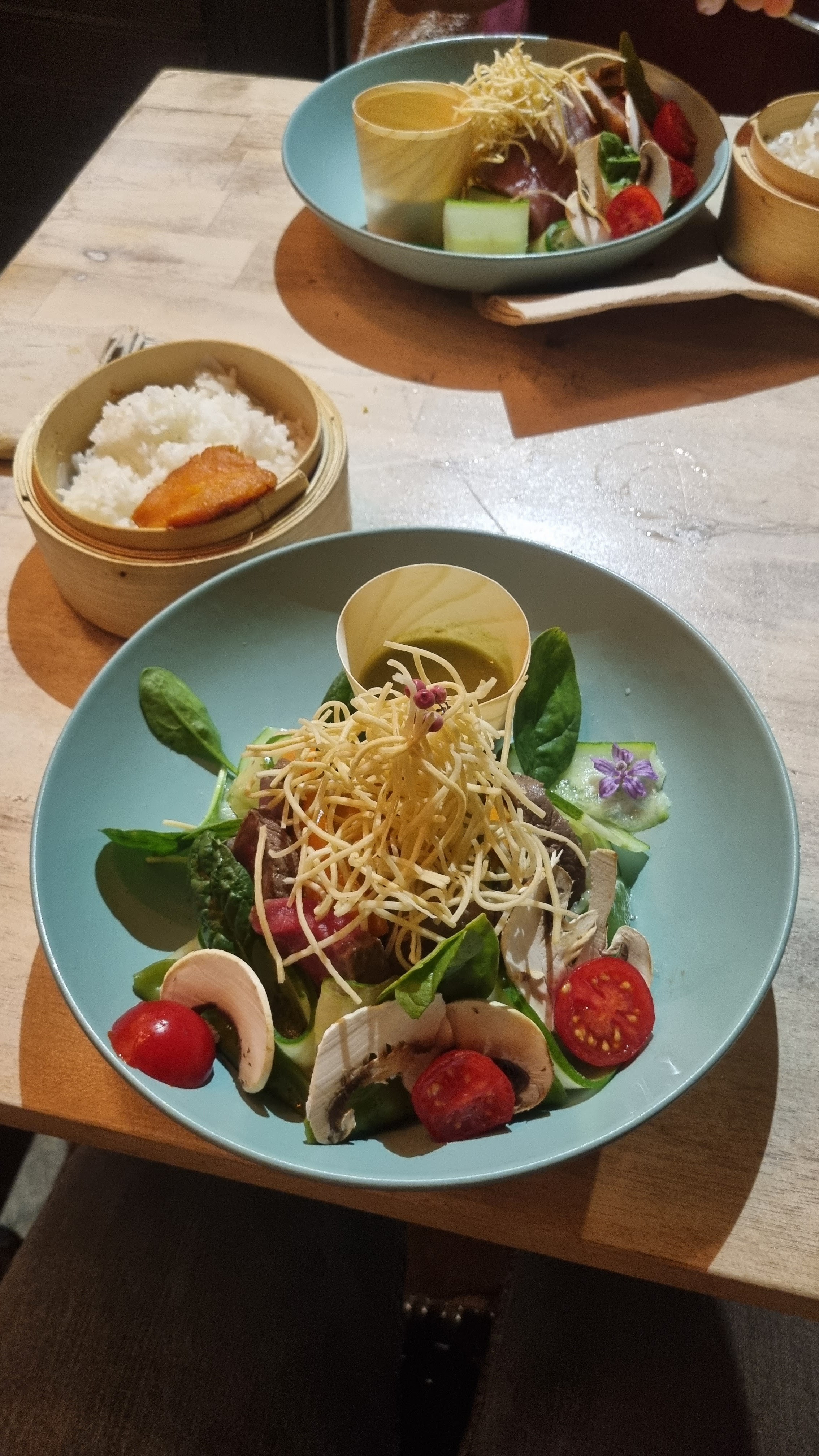 Bonjour, nous avions choisi le ceviche XL de dorade. C’était joliment présenté d’un point de vue gustatif. Je suis un tout petit peu resté sur ma fin, mais le plus gênant était vraiment les quantités qui tenait plus d’une entrée avec environ 40 g de poisson, 20 g de concombre et 20 g de tomates en petits cubes, le tout servi dans une assiette creuse sous la forme de soupe de coco légèrement épicé Cela tenait plus d’une entrée que d’un plat Il y avait 40 g de riz et une rondelle de patates douces, servie dans un Plat à vapeur asiatique en lieux d accompagnement Nous sommes restés un peu sur notre faim, et avons décidé d’aller prendre la suite du repas ailleurs ce qui est fort dommage