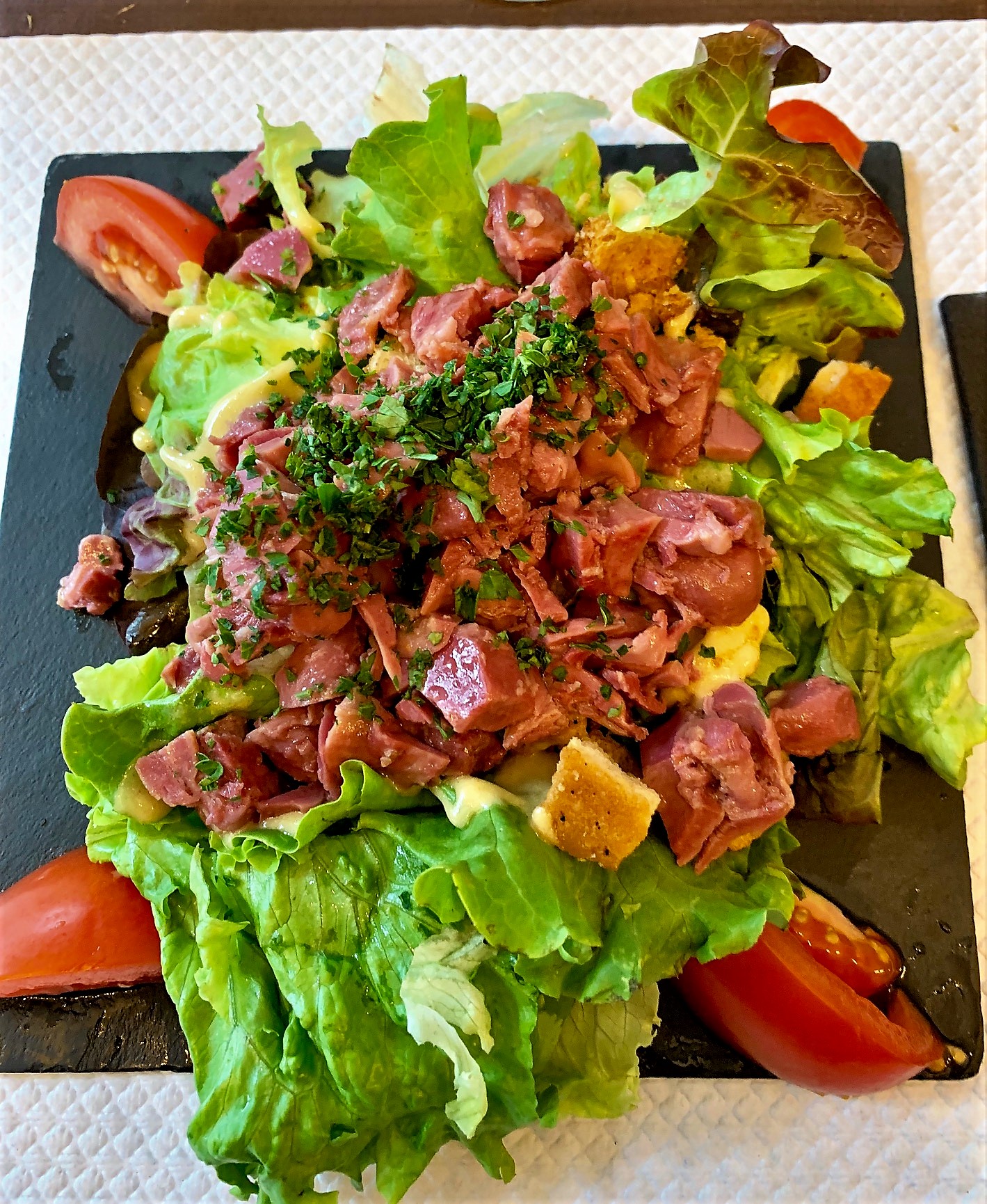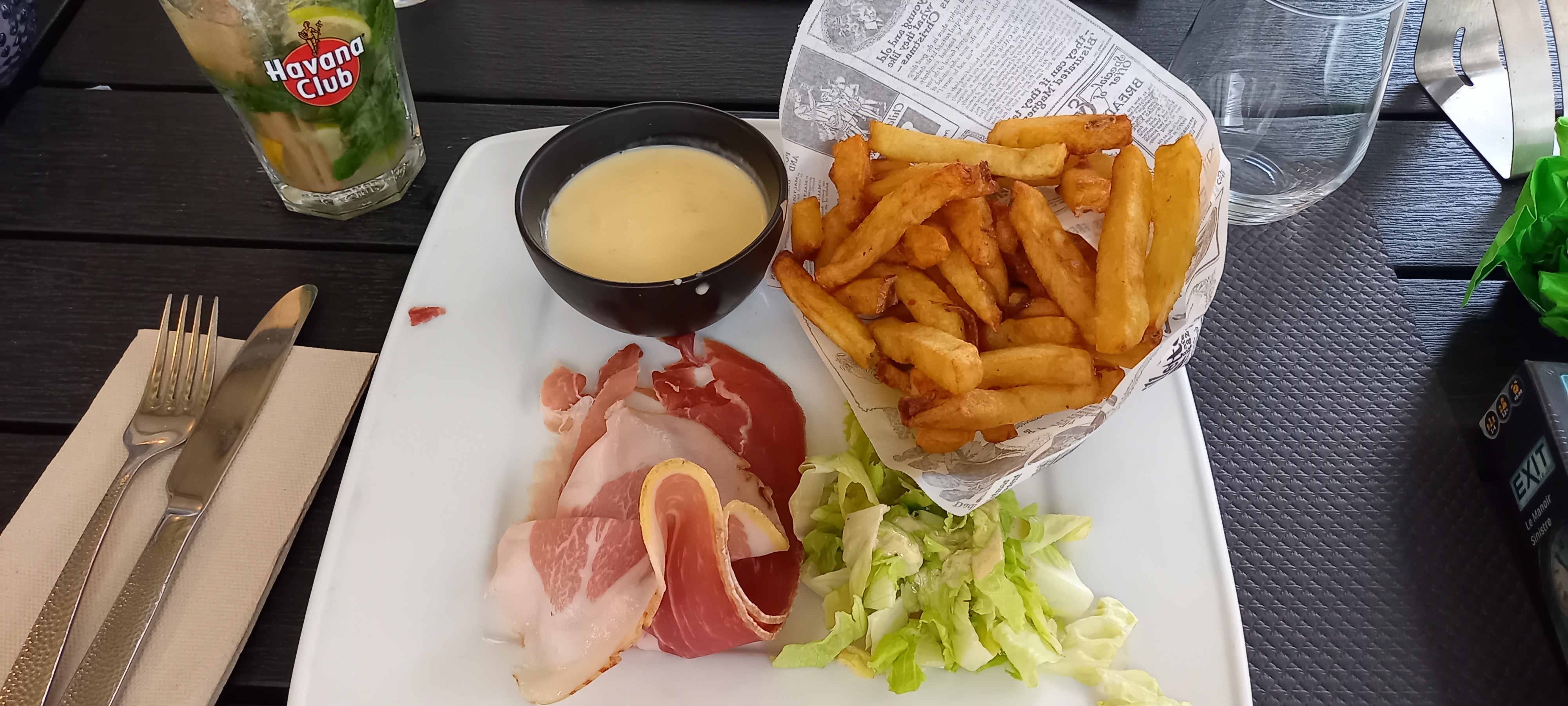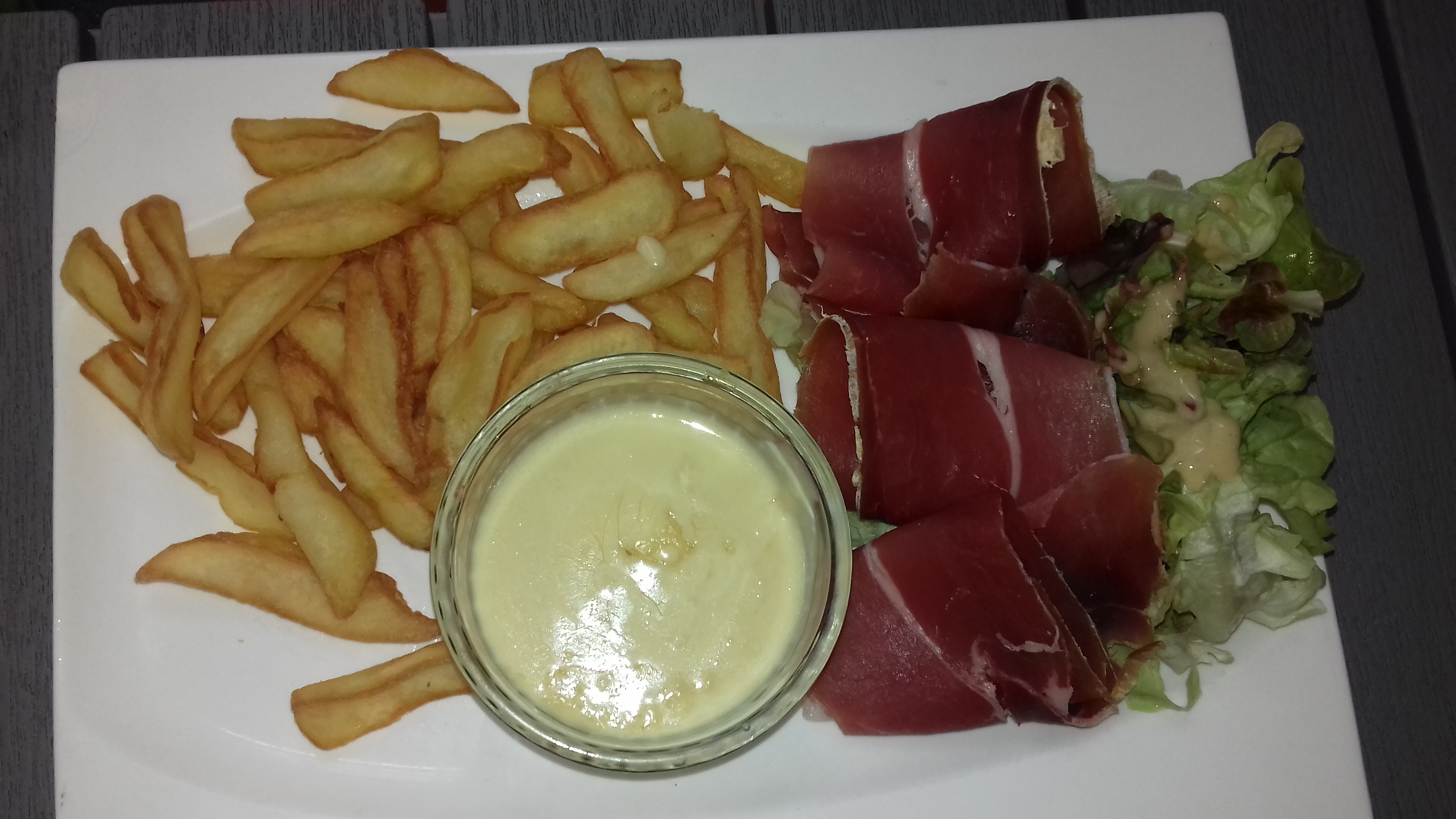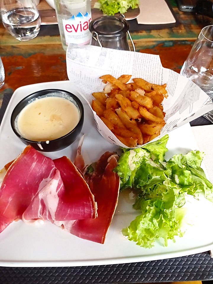 Bof bof bof... En plus d'un service très très long, Je n'ai pu finir ma salade composée d'une laitue de basse qualité, de frites surgelées sans intérêt, d'une sauce industrielle et salée mais aussi de tranches de jambon bas de gamme taillées à la hache. Heureusement la patronne nous accueille avec le sourire.