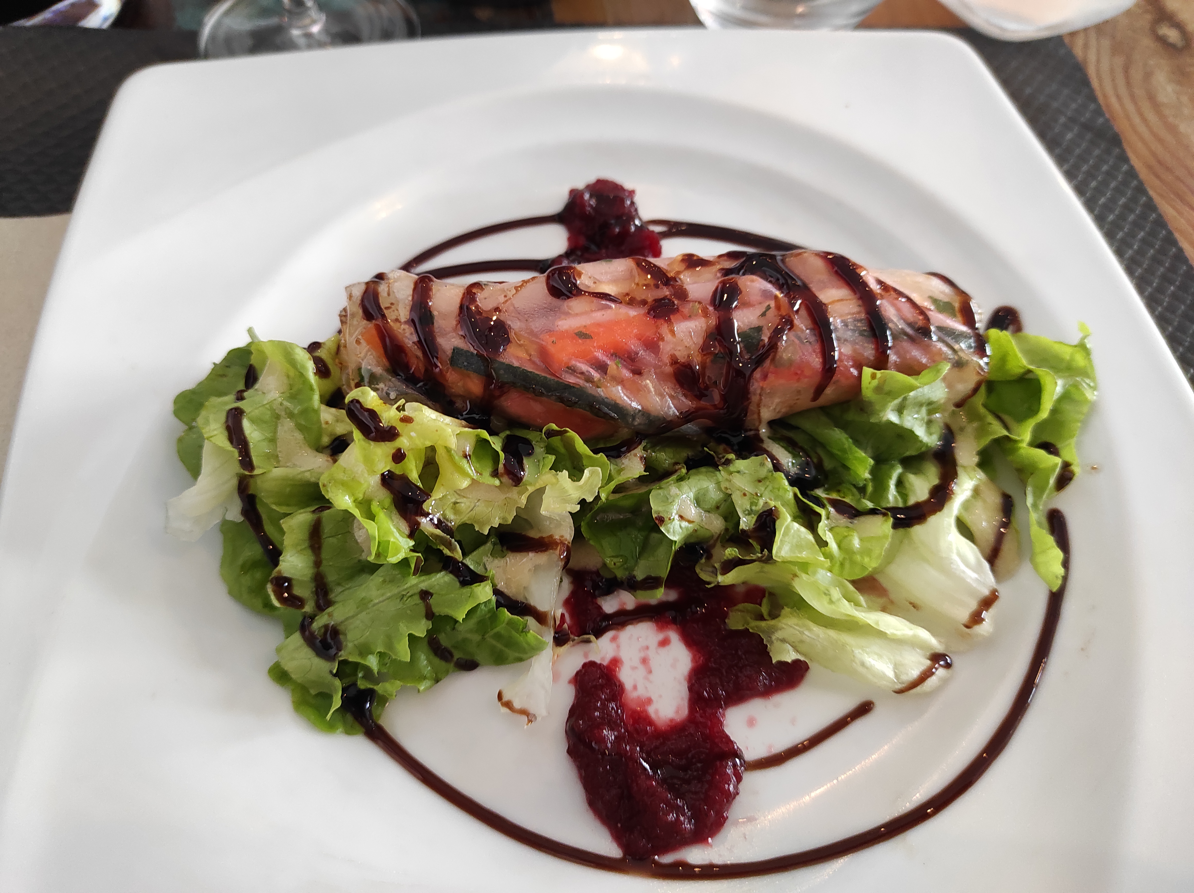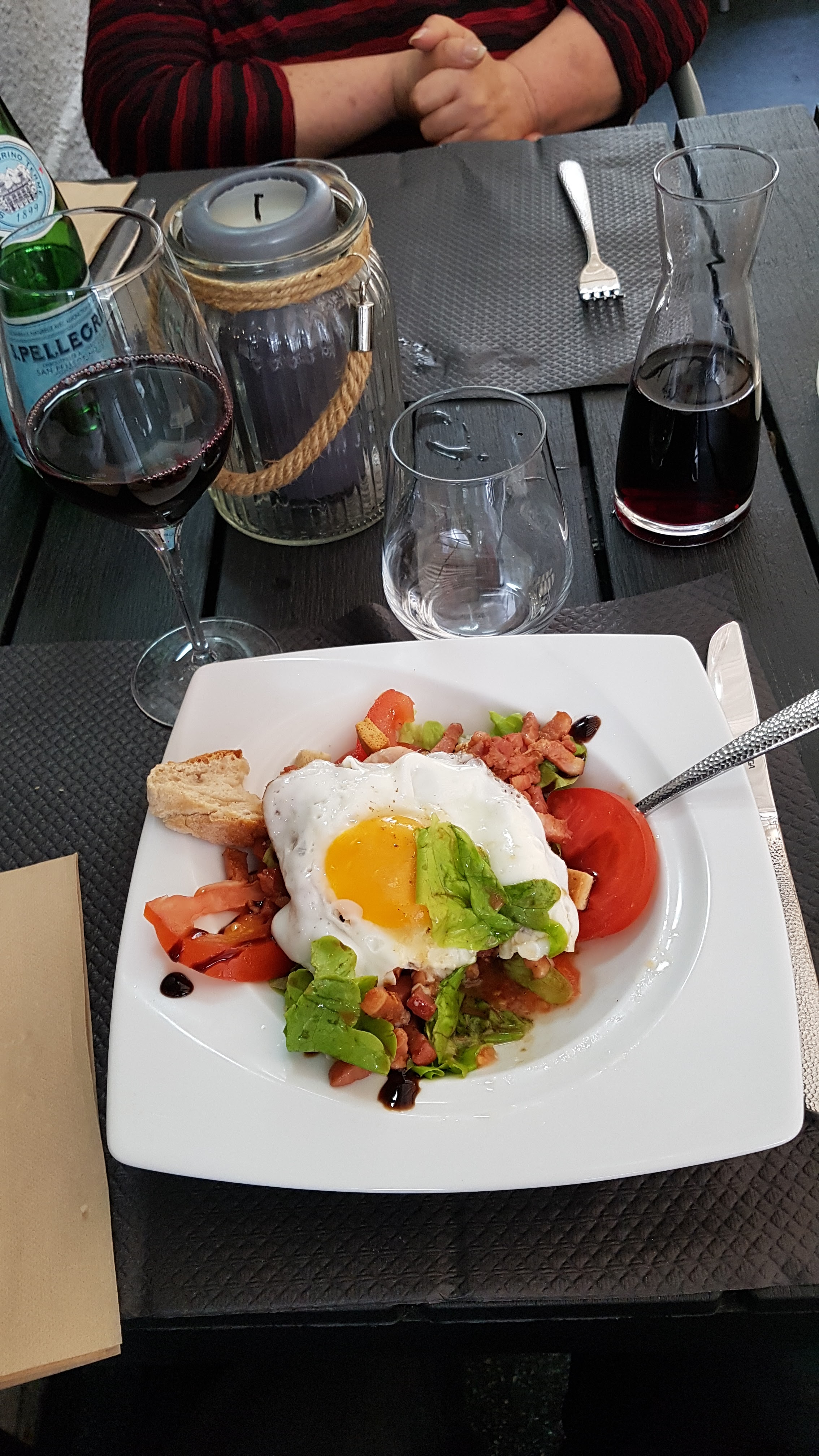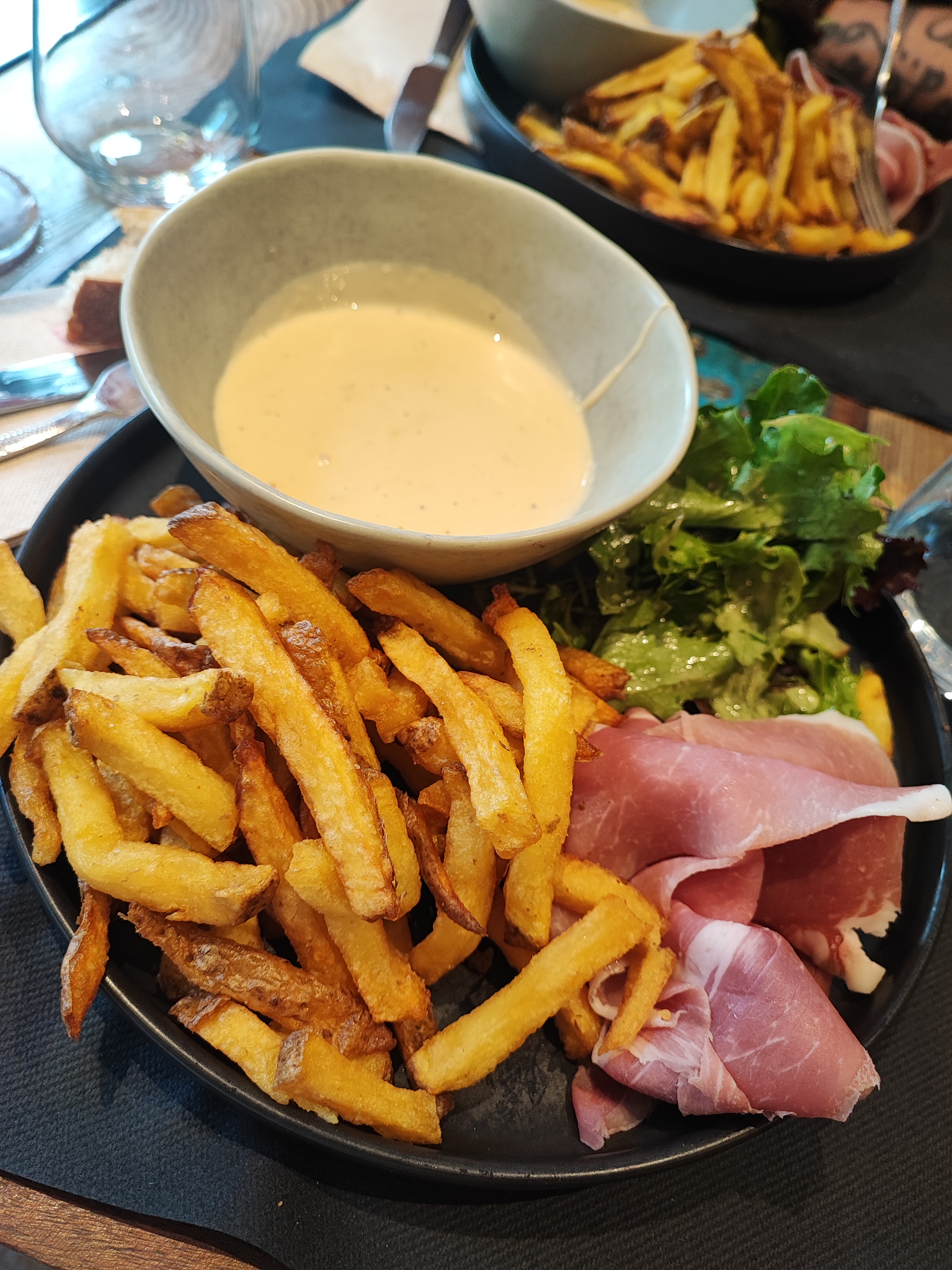 Bof bof bof... En plus d'un service très très long, Je n'ai pu finir ma salade composée d'une laitue de basse qualité, de frites surgelées sans intérêt, d'une sauce industrielle et salée mais aussi de tranches de jambon bas de gamme taillées à la hache. Heureusement la patronne nous accueille avec le sourire.