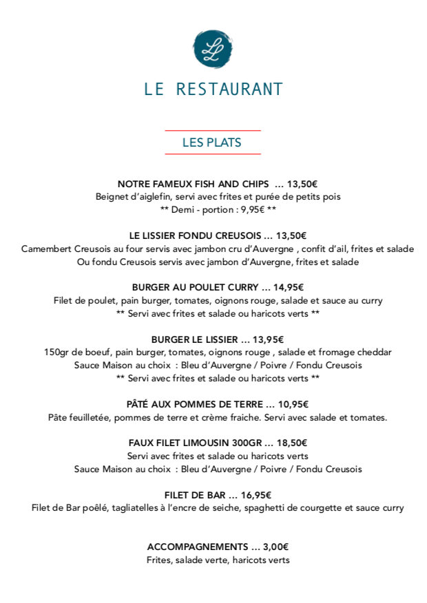 Un semaine à aubusson et je découvre Le lissier. Vous trouverez la ba une equipe humaine et doué qui ne semble pas cracqie4 son la pression. Un cuisinier qui se soucie de chaque assiette de chaque personne, n'hésitent pas a venir en salle. Des serveuses souriantes et pro, et les plat... enfin... mama les PLATS c'est BON, copieux sans être lourd, varié, des desserts revisiter et délicieux et ABSOLUMENT TOUT est fait maison, de la pâte à choux aux frites, des crèmes pâtissière aux steak acheté à la minute et à la demande... nan sérieusement il est 8 h du matin alors que j'ecrit ce commentaire et je me donne faim tout seul. Une chose est sûr quand je reviendrais à aubusson, j'irai au Lissier.